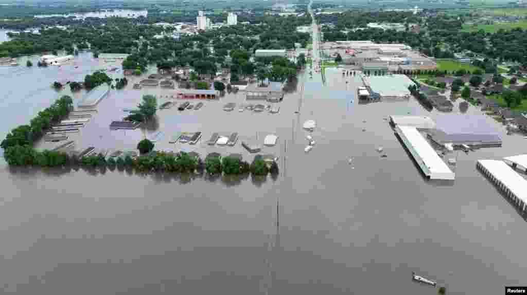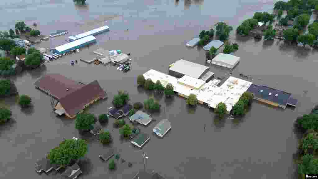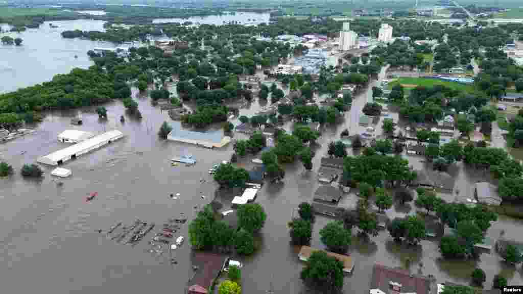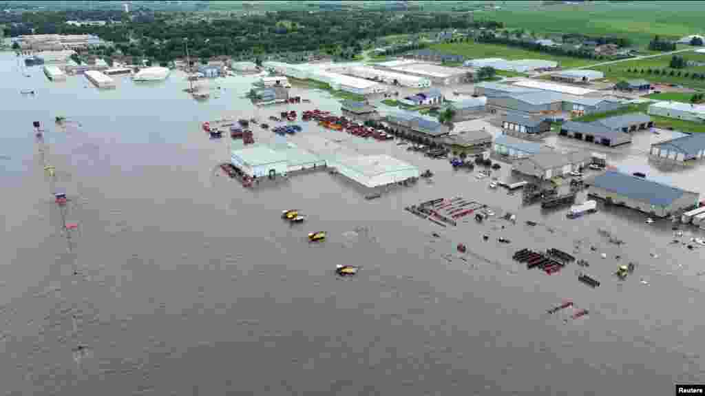 সোশ্যাল মিডিয়া ভিডিও থেকে নেওয়া এই ফটো গ্যালারীটি যুক্তরাষ্ট্রের আইওয়া রাজ্যের রক ভ্যালিতে ভারী বৃষ্টিপাতের পরে প্লাবিত এলাকাটির চিত্র দেখায় যা ড্রোন থেকে তোলা হয়েছে। জুন ২২, ২০২৪।