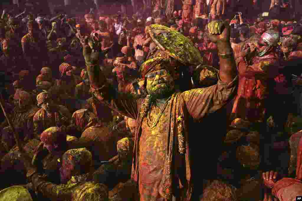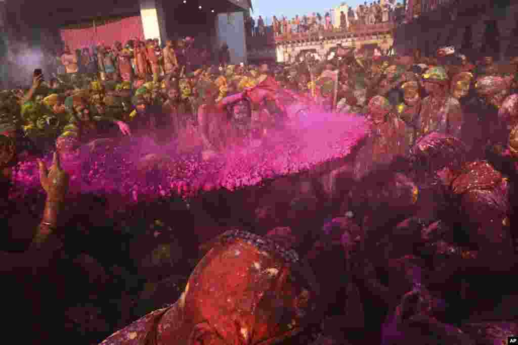 ছবিতে ভারতের নয়াদিল্লি থেকে ৭০ মাইল দক্ষিণে অবস্থিত বরসানা এবং নন্দগাঁওয়ের গ্রামবাসীদের নন্দগ্রাম মন্দিরে হোলি উৎসবে অংশ নিতে দেখা যাচ্ছে। রবিবার, ৯ মার্চ, ২০২৫।